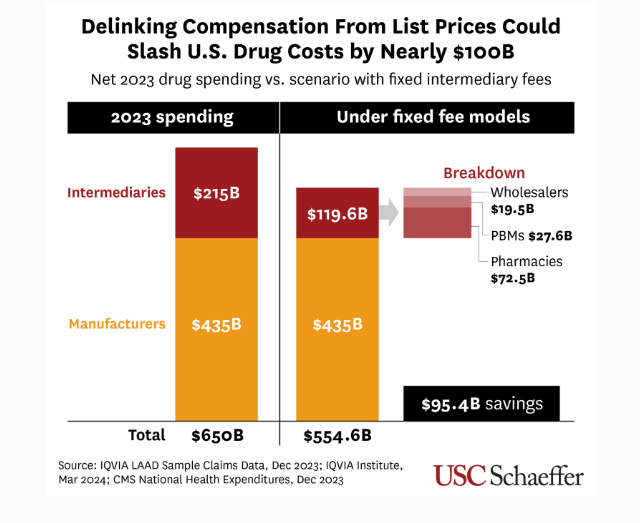 The U.S. spent $650 billion on prescription drugs in 2023 after factoring in discounts, with about one-third ($215 billion) flowing to PBMs, wholesalers and pharmacies — though the exact division of these costs is unclear. However, using simplified estimates, Joyce finds spending on these intermediaries would have dropped to $119.6 billion under fair and transparent compensation models.